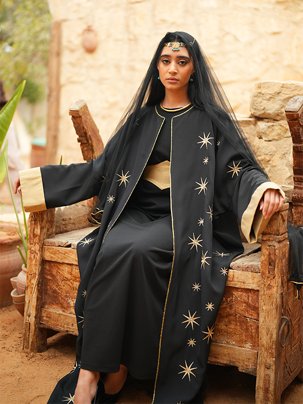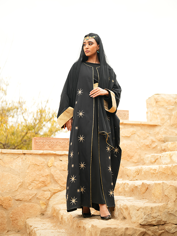 Step into a world of celestial elegance with the Embroidery Stars Onyx Kaftan, a masterpiece that captures the magic of a starlit night. Dressed in deep, timeless black, this stunning piece is adorned with intricate Indian embroidery featuring shimmering gold stars, creating a striking contrast that exudes sophistication and allure. Crafted from premium Rosaline fabric, it offers a luxurious drape and a silky-smooth feel, making it as comfortable as it is captivating.